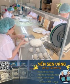 Sau khi ngâm nước, đội ngũ nhân viên được đeo bao tay diệt khuẩn và khẩu trang để sơ chế, nhặt lông chim yến và làm sạch hoàn toàn bằng thủ công, bằng nguồn nước thủy cục, lọc 3 cấp. Chúng tôi cam kết không dùng bất kỳ một hóa chất nào, không sử dụng chất bảo quản, không sử dụng chất độn để tăng trọng.Tổ yến được giũ nguyên tai như tổ yến thật hoặc tạo thành viên tròn. Sản phẩm đã được sấy khô tuyệt đối bằng hệ thống sấy kín, nên không bị bụi bẩn, vệ sinh tối đa và diệt khuẩn bằng tia cực tím trước khi đóng gói, có thể bảo quản được trong điều kiện môi trường khô ráo, thoáng mát lâu dài trong 6 tháng mà vẫn không ảnh hưởng đến chất lượng.